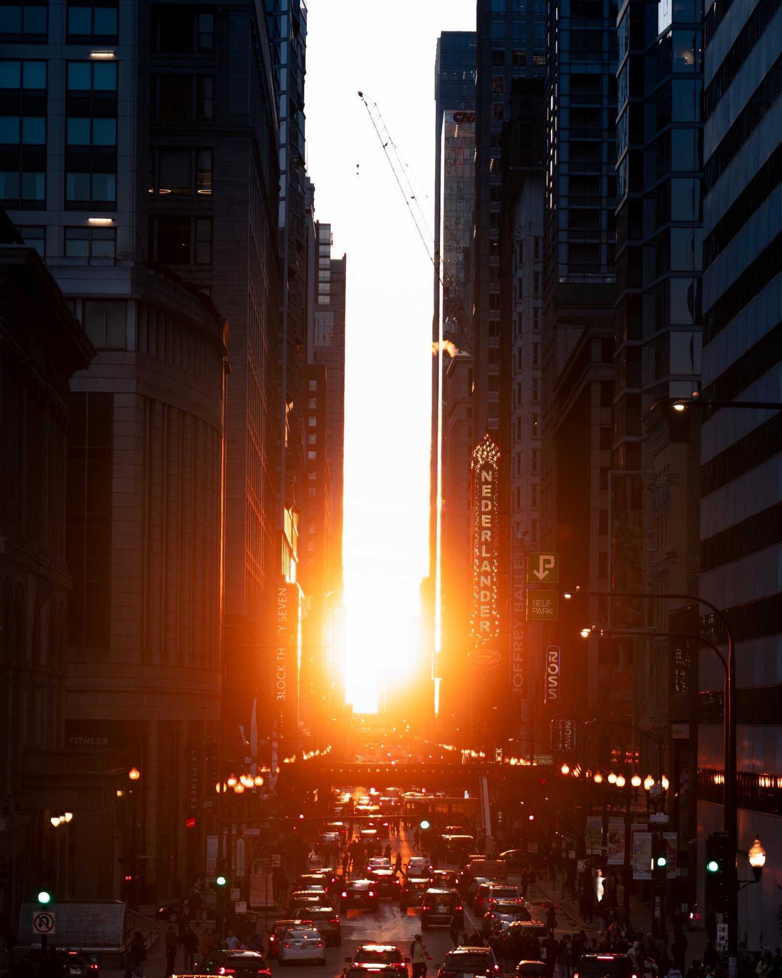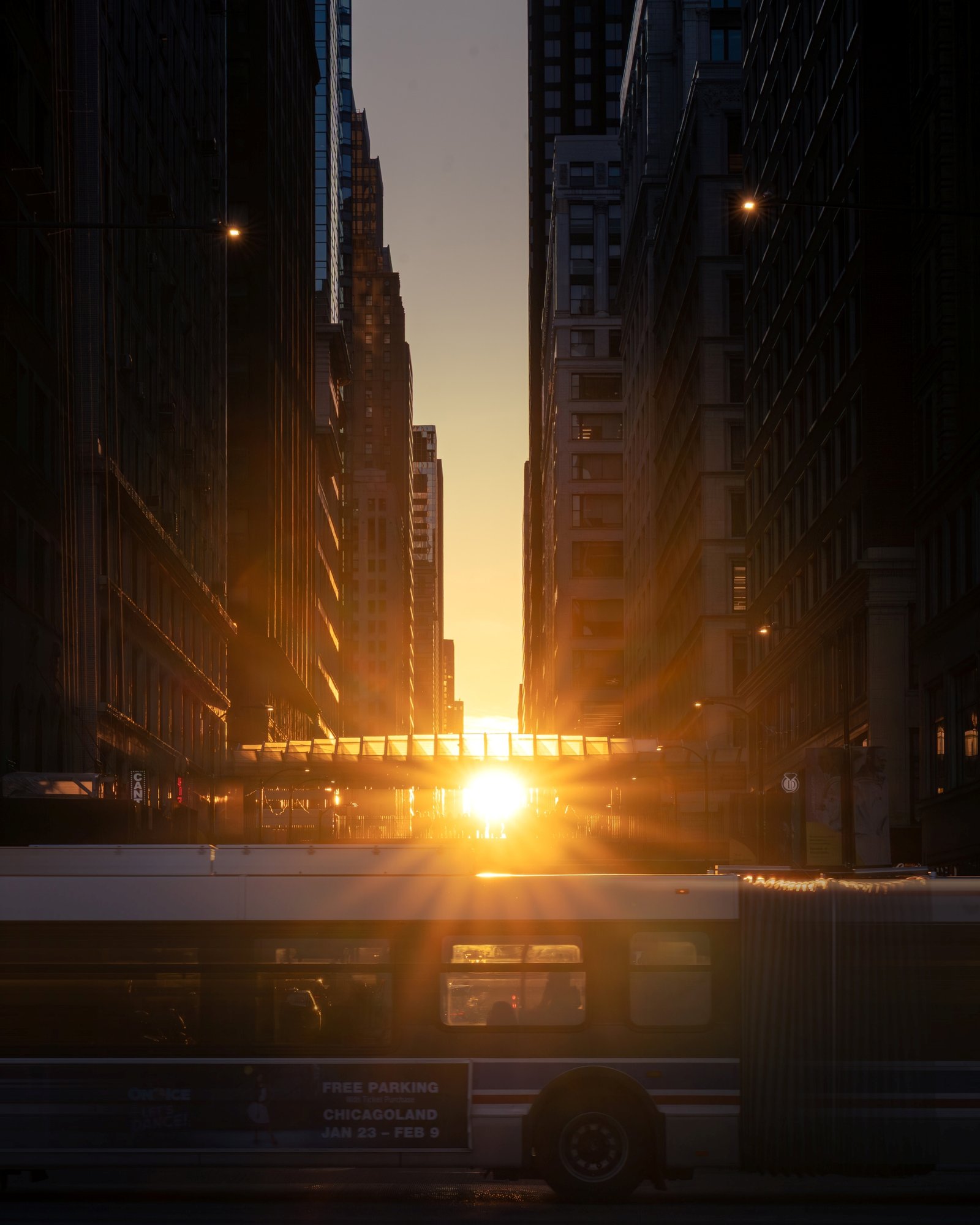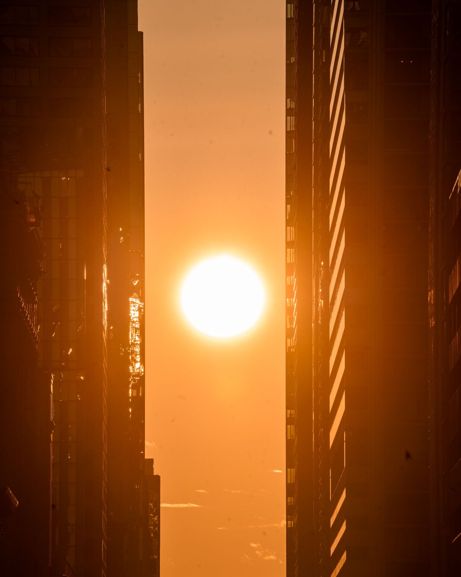 The effect is most pronounced during both sunrise and sunset, when the sun appears to sit directly between the canyon of buildings, casting dramatic shadows and bathing the entire street in golden light.
